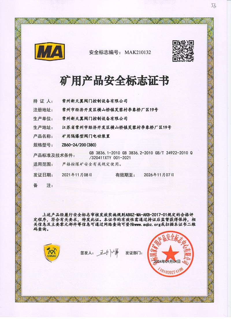 礦用產品安全標志證書ZJK60-24(380)